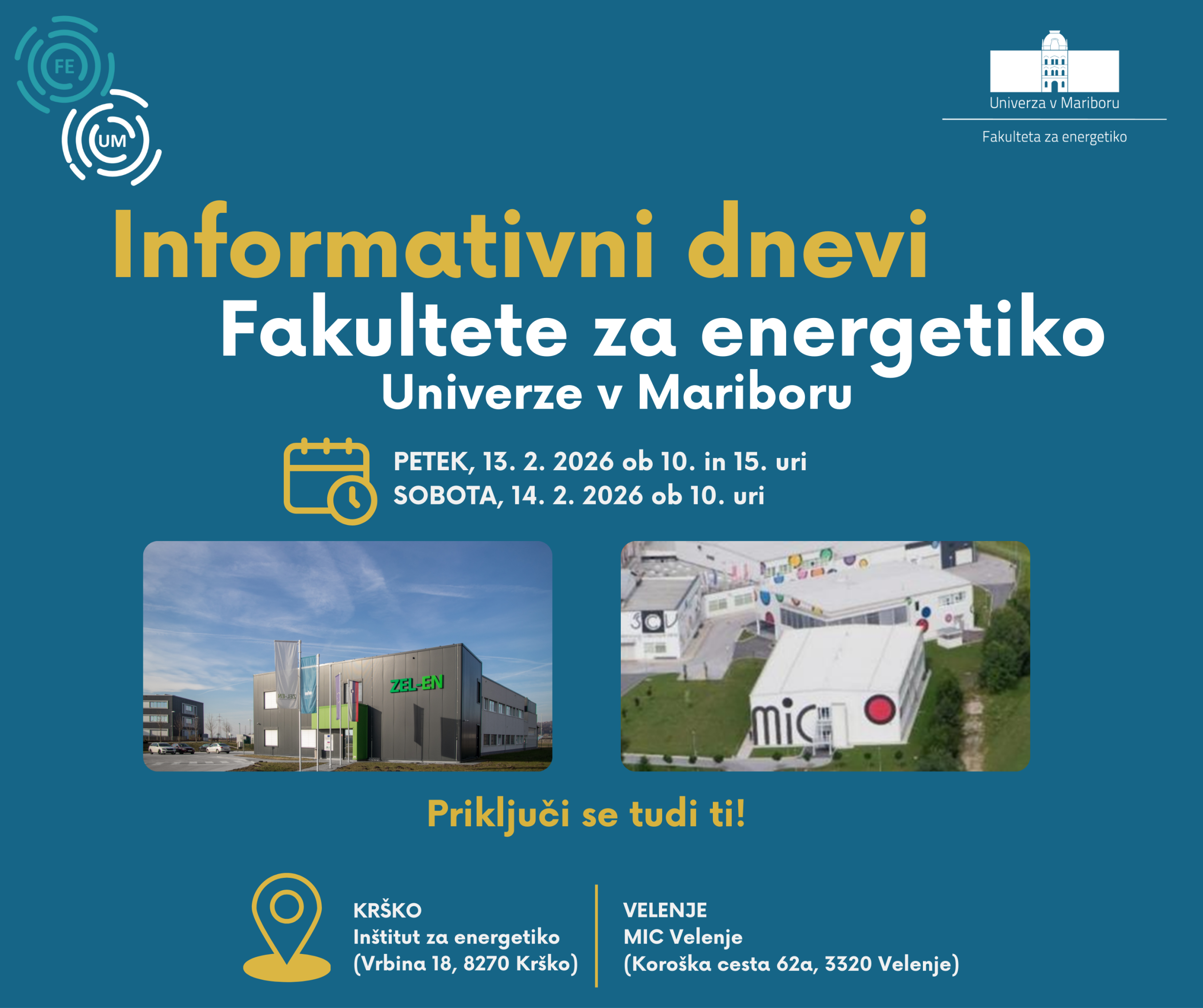 Veseli nas, da ste si kot eno izmed možnih izbir za študij izbrali Fakulteto za energetiko Univerze v Mariboru. Fakulteta za energetiko je članica Univerze v Mariboru, ki svoje študijske programe izvaja v Krškem in Velenju. Lokaciji študija nista izbrani naključno; študij tako poteka v dveh največjih energetskih bazenih v Sloveniji, kjer imajo študenti omogočen stik z velikimi energetskimi sistemi.